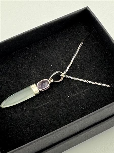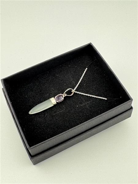 This stunning Aquamarine and Amethyst pendant on a sterling silver chain combines two powerful crystals known for their calming and stress-relieving properties. Aquamarine enhances communication, self-expression, and emotional clarity, while Amethyst promotes relaxation, reduces anxiety, and fosters peace of mind. Together, they create a harmonious balance of energies. The pendant, measuring approximately 35mm x 10mm, comes beautifully presented in a gift box. You will receive the exact piece shown in the photos.