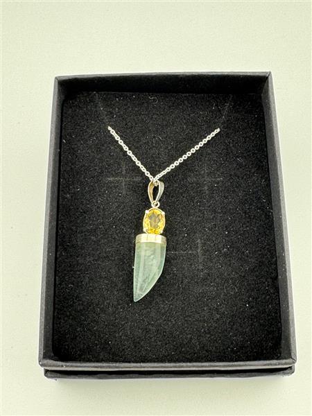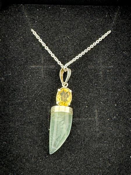 This beautiful Aquamarine and Citrine pendant on a sterling silver necklace is a stunning combination of two powerful crystals. Aquamarine is believed to promote calmness, mental clarity, and emotional protection, enhancing communication and self-expression. Citrine adds a vibrant energy that encourages confidence, positivity, and personal empowerment. The pendant, measuring approximately 30mm x 10mm, will be the exact piece shown in the photos, making it a unique and meaningful addition to your jewellery collection.