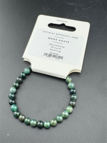 This 6mm Moss Agate crystal bracelet is believed to promote abundance, personal growth, and emotional healing. Known for its deep connection to nature, Moss Agate supports new beginnings and helps balance emotions. Its earthy tones make it a grounding and stylish accessory, perfect for daily wear or spiritual practices.