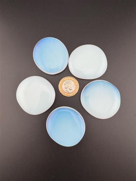 Opalite, a beautiful man-made crystal, is believed to promote emotional balance, foster inner peace, and clear energy blockages. Known for supporting spiritual growth and intuition, it’s also thought to improve sleep quality and boost self-esteem. Each piece measures approximately 40mm in diameter, with natural variations in colour, shading, and size, making every stone unique.