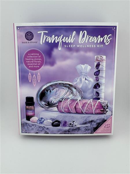 Promote restful sleep and tranquil dreams with this complete sleep wellness gift set. For centuries, crystals and gemstones have been valued for their calming, healing properties. This kit includes Rose Quartz, Sodalite, Clear Quartz, Obsidian, Amethyst, Dalmatian Jasper, a Selenite wand with Amethyst stones, Lavender essential oil, a floral lavender smudge wand, an Abalone smudging shell, and a drawstring satchel for storage.